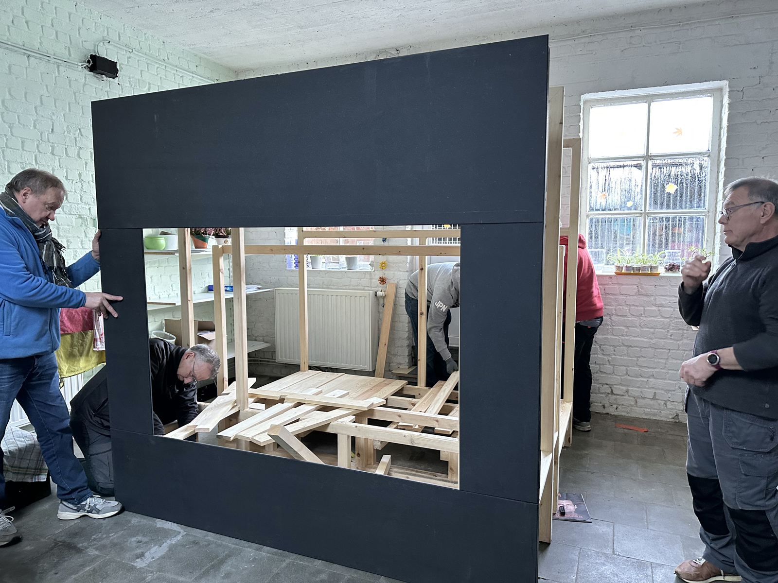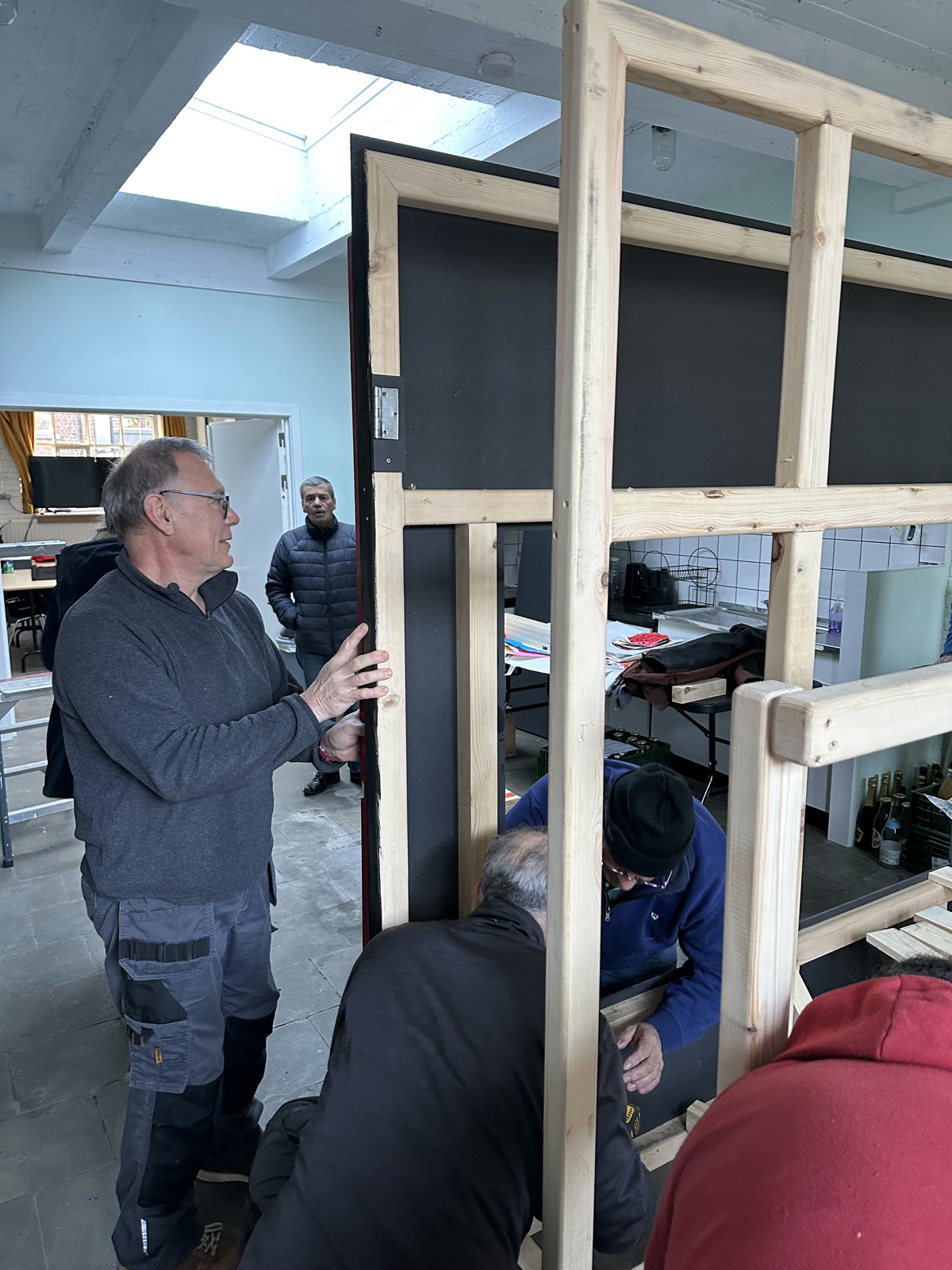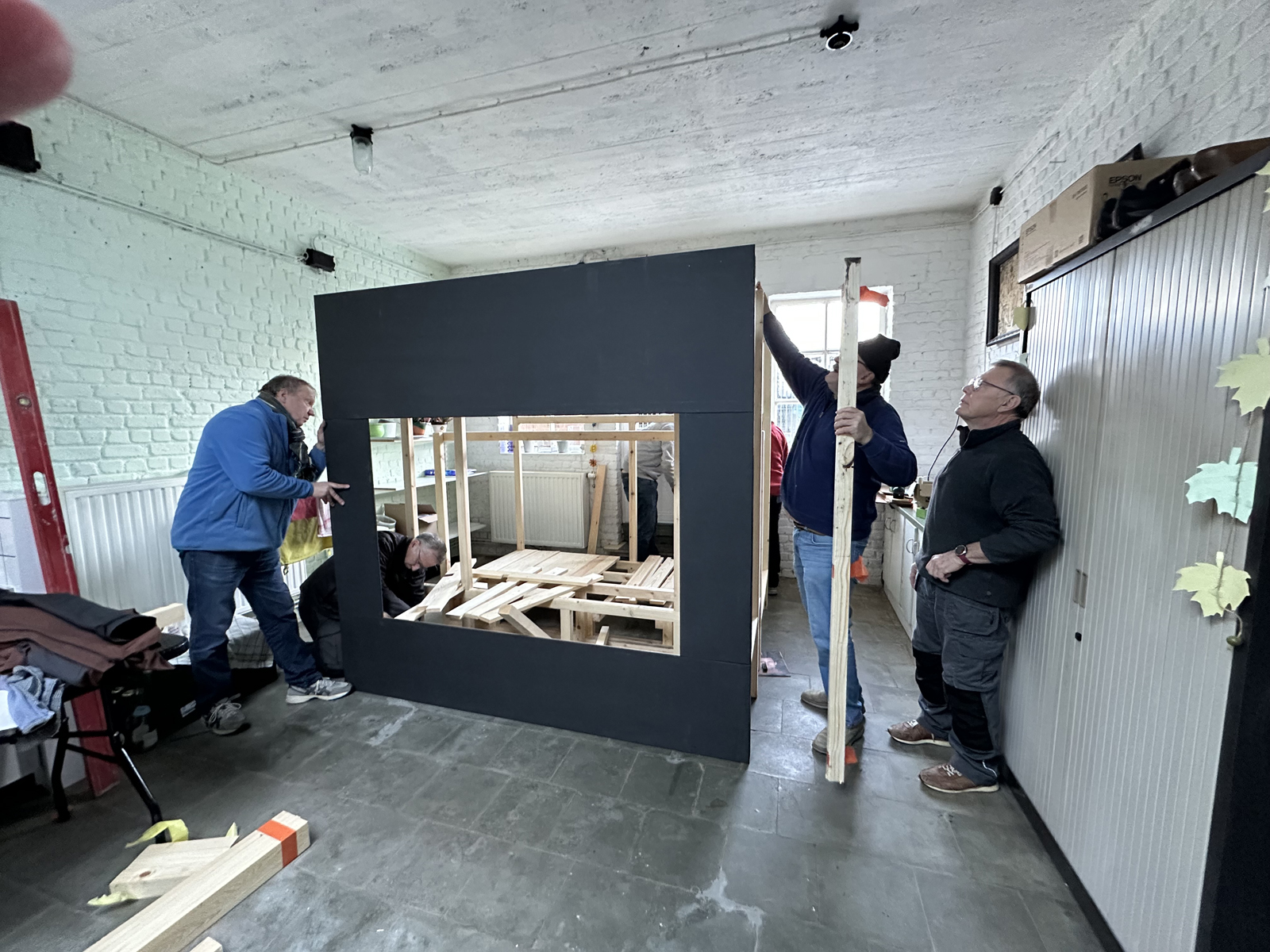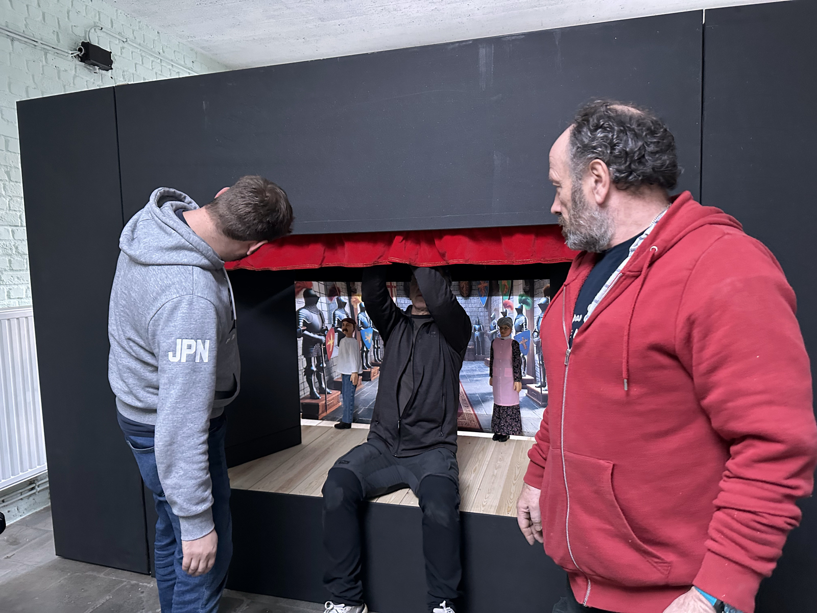Malgré une météo très hivernale qui a compliqué l’acheminement du matériel à Bruxelles, c’est finalement dans la bonne humeur généralisée que le castelet a pu être rapidement monté et qu’une première initiation à la manipulation des marionnettes à tringle a été assurée. Il restera à finaliser quelques détails comme monter le rideau de la scène et fixer le logo de l’atelier sur le fronton du castelet, l’occasion de revoir les membres de cette sympathique équipe de médecin psychiatre , de psychologues et d’animateurs motivés.
