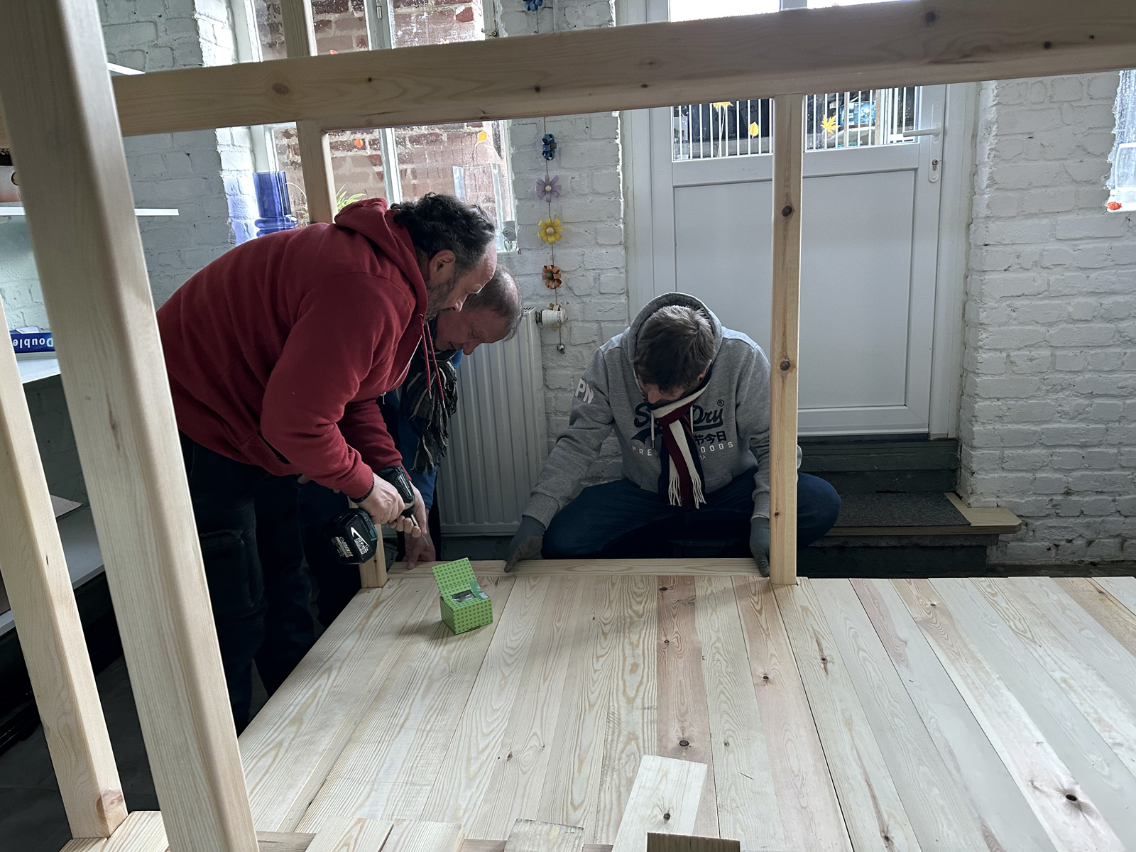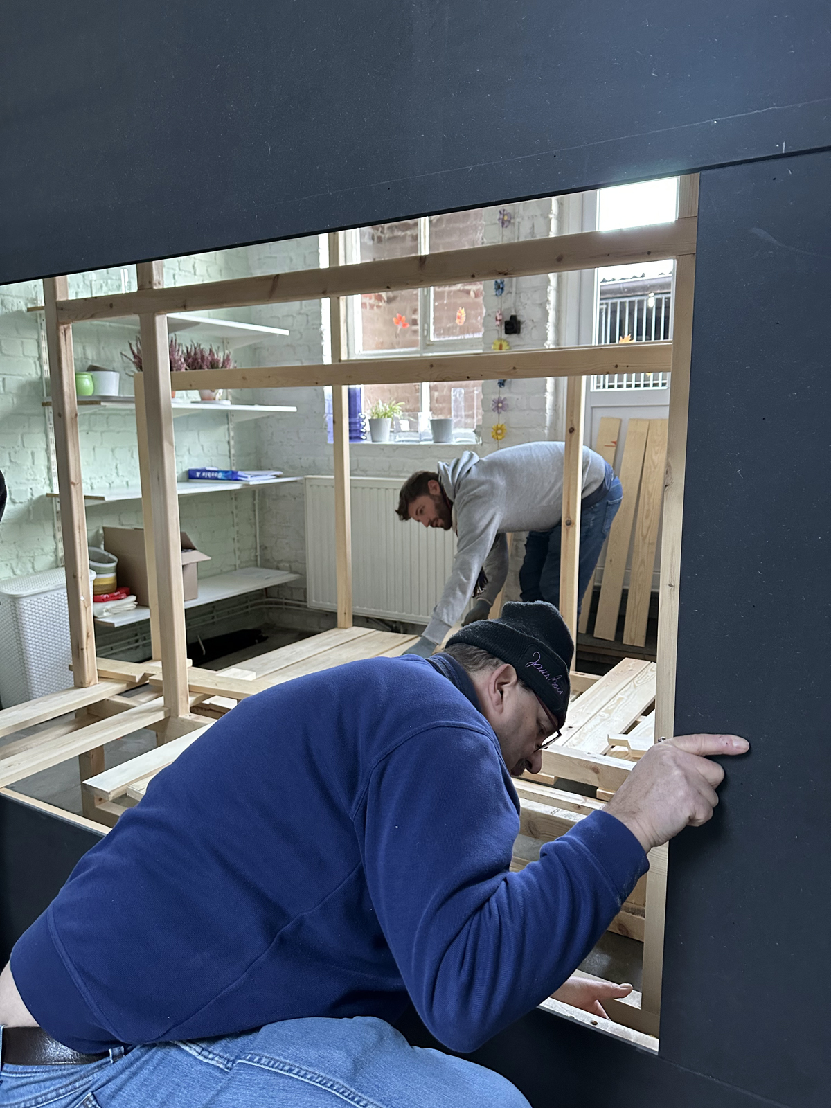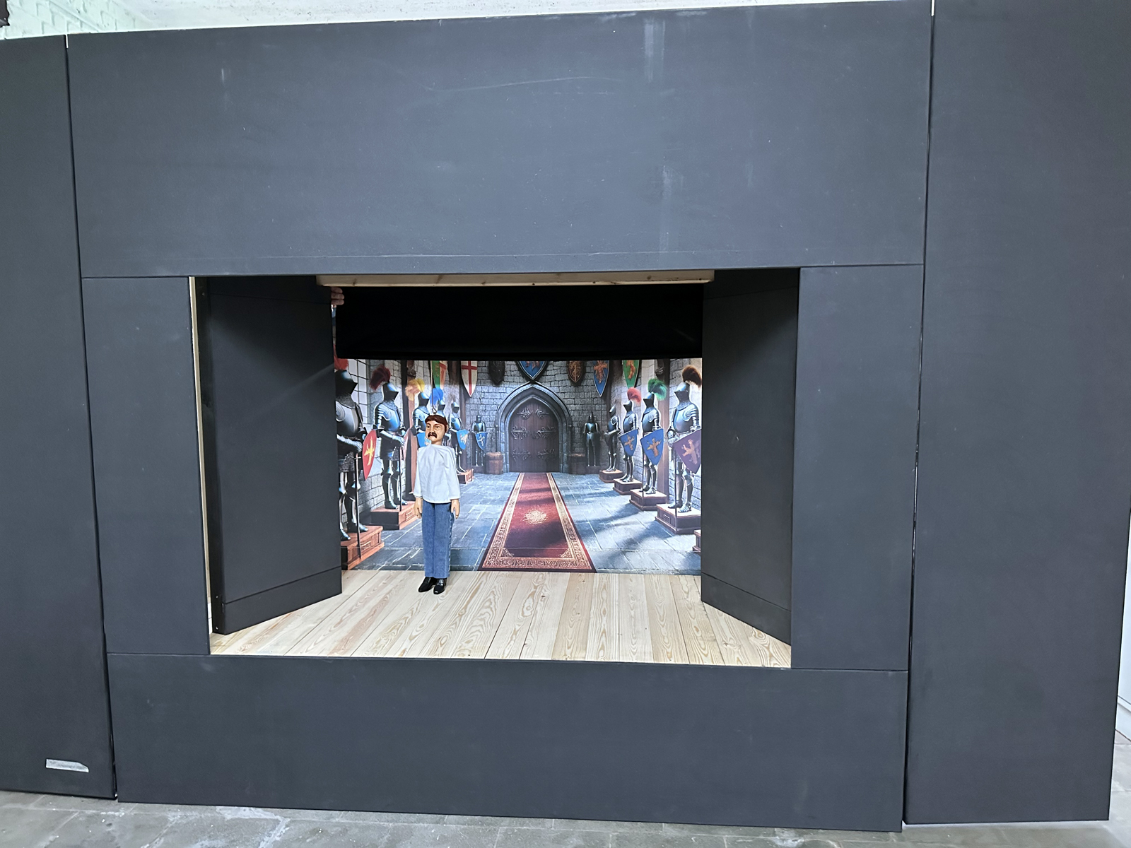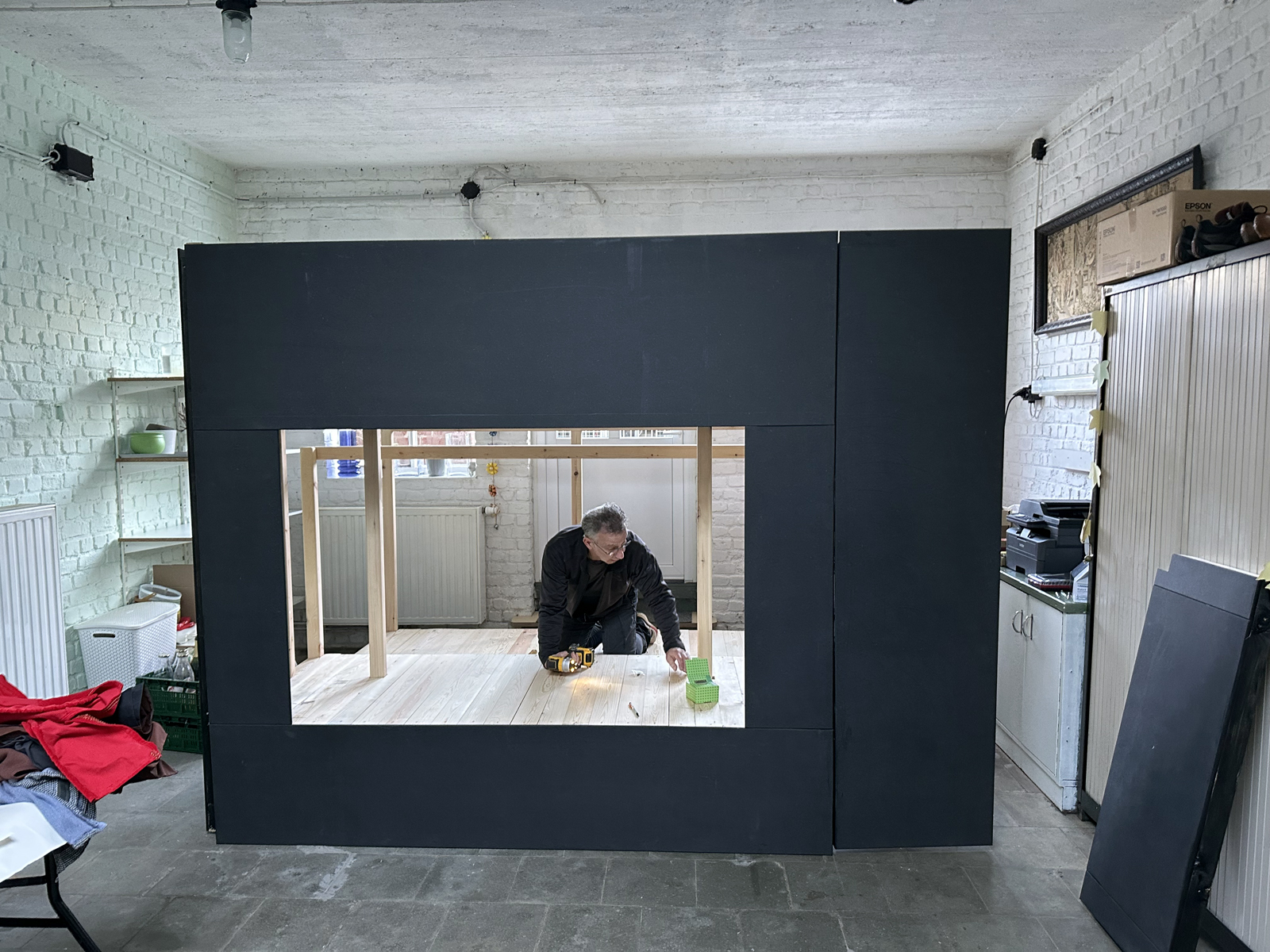 Malgré une météo très hivernale qui a compliqué l’acheminement du matériel à Bruxelles, c’est finalement dans la bonne humeur généralisée que le castelet a pu être rapidement monté et qu’une première initiation à la manipulation des marionnettes à tringle a été assurée. Il restera à finaliser quelques détails comme monter le rideau de la scène et fixer le logo de l’atelier sur le fronton du castelet, l’occasion de revoir les membres de cette sympathique équipe de médecin psychiatre , de psychologues et d’animateurs motivés.