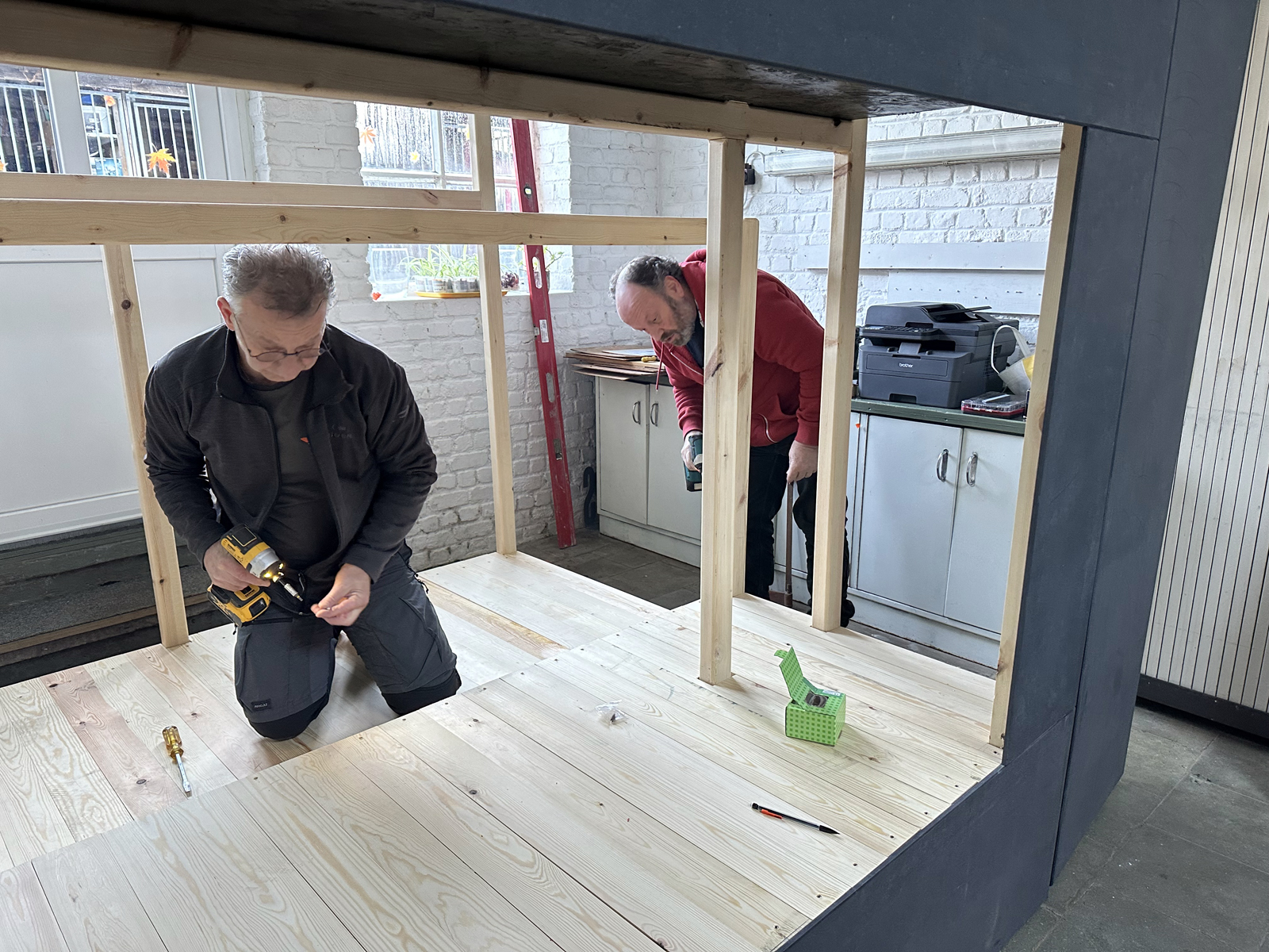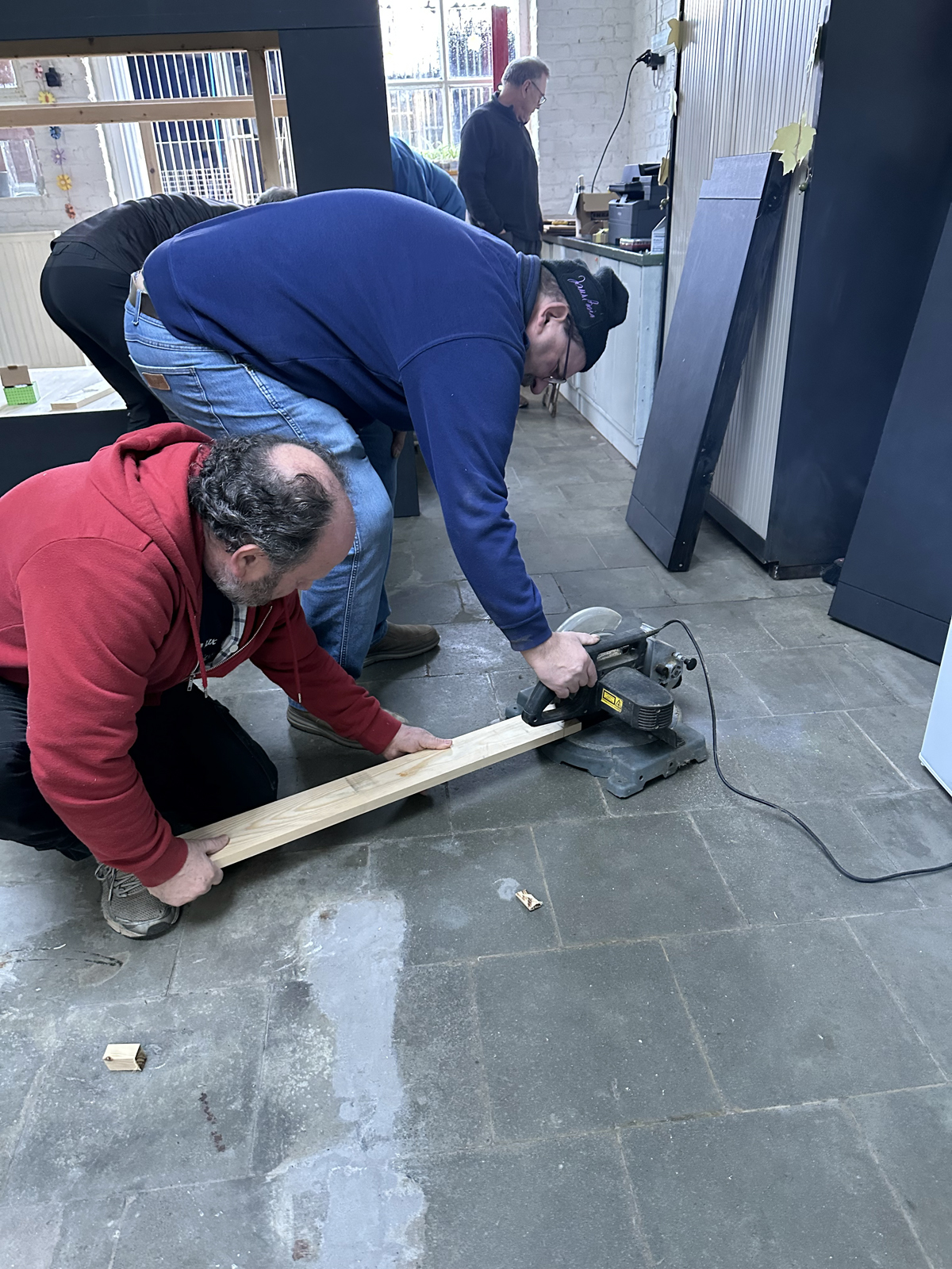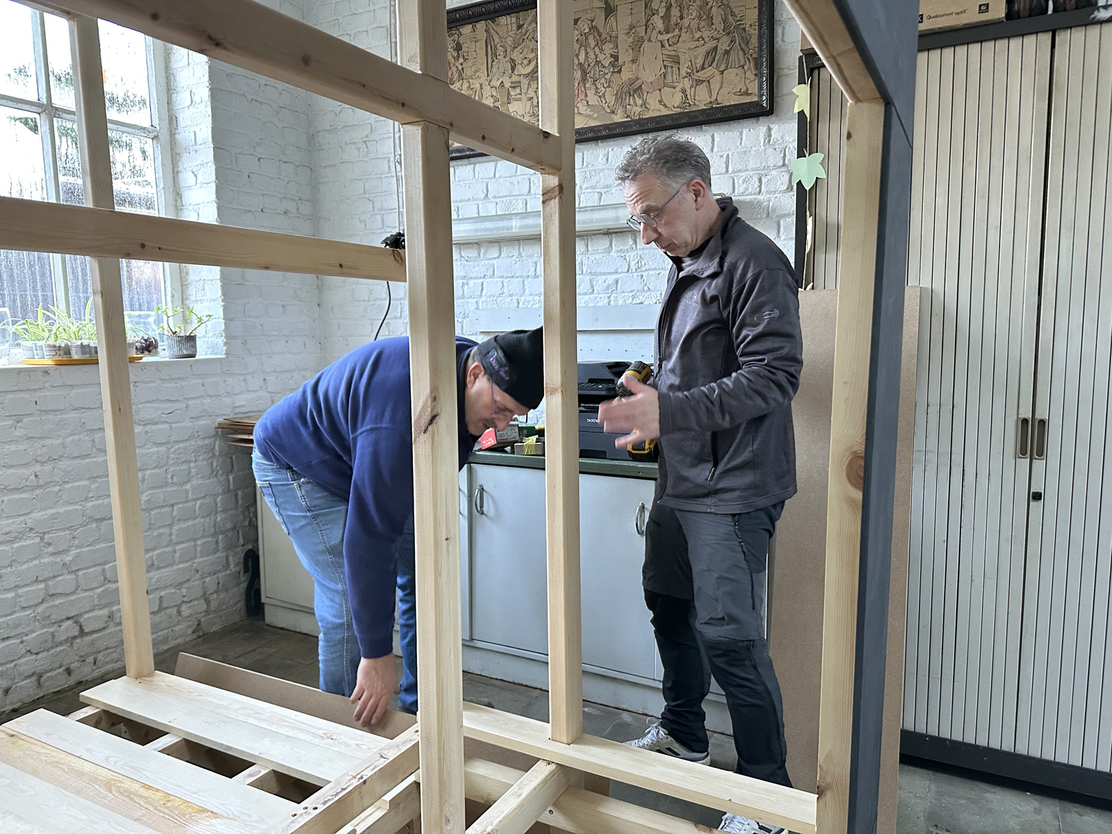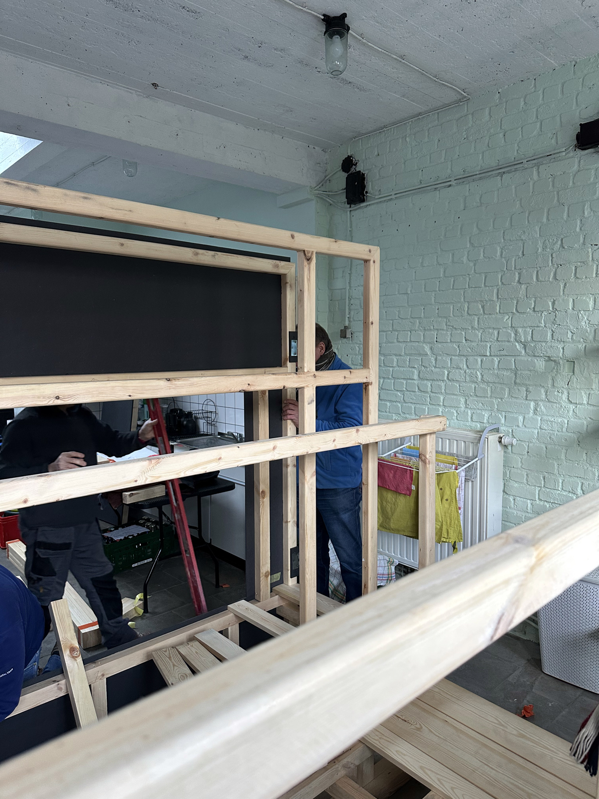 Malgré une météo très hivernale qui a compliqué l’acheminement du matériel à Bruxelles, c’est finalement dans la bonne humeur généralisée que le castelet a pu être rapidement monté et qu’une première initiation à la manipulation des marionnettes à tringle a été assurée. Il restera à finaliser quelques détails comme monter le rideau de la scène et fixer le logo de l’atelier sur le fronton du castelet, l’occasion de revoir les membres de cette sympathique équipe de médecin psychiatre , de psychologues et d’animateurs motivés.